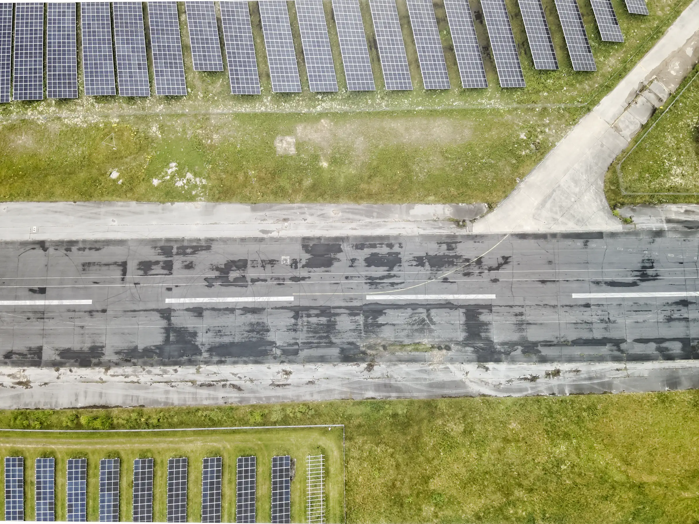 Das Luftbild der Photovoltaik-Freilandanlage zeigt eine Landebahn des ehemaligen Flugplatzgeländes.